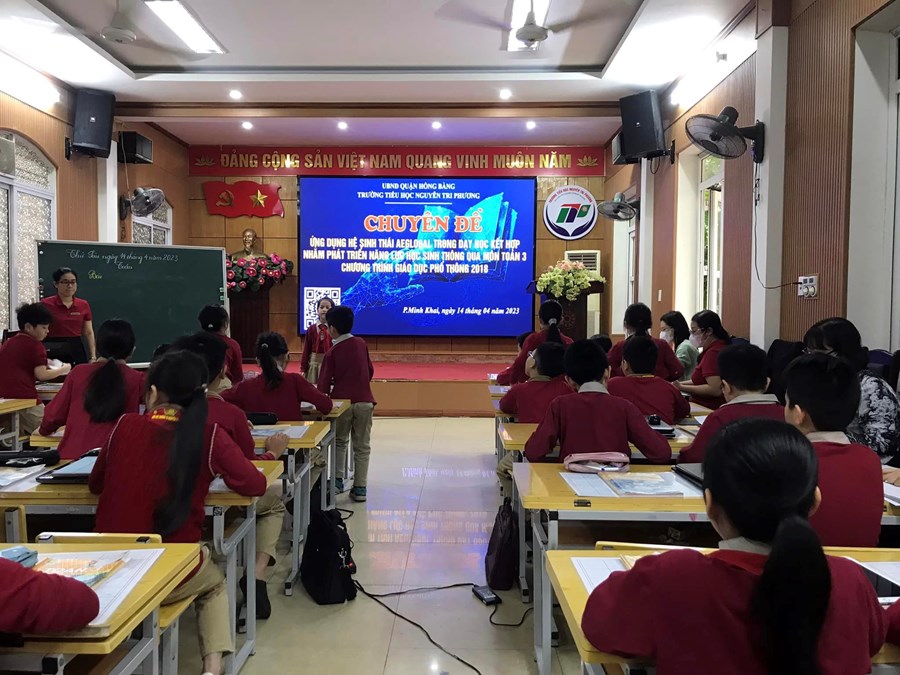 Nhằm thực hiện Chương trình Chuyển đổi số ngành Giáo dục và Đào tạo theo định hướng dạy học phát triển năng lực tự học, năng lực số, dạy học dựa trên trải nghiệm; giúp giáo viên kết nối, sử dụng được hệ sinh thái giáo dục AEGlobal, làm rõ việc áp dụng dạy học kết hợp (Blended learning) trong một số hoạt động trên lớp cũng như phát triển năng lực của học sinh. Chiều ngày 14/4/2023, giáo viên khối 3 đã xây dựng và tổ chức thành công Chuyên đề “Ứng dụng Hệ sinh thái AE Global trong Dạy học Kết hợp nhằm phát triển năng lực học sinh thông qua môn Toán 3 chương trình GDPT 2018”