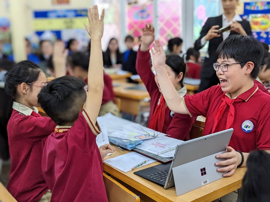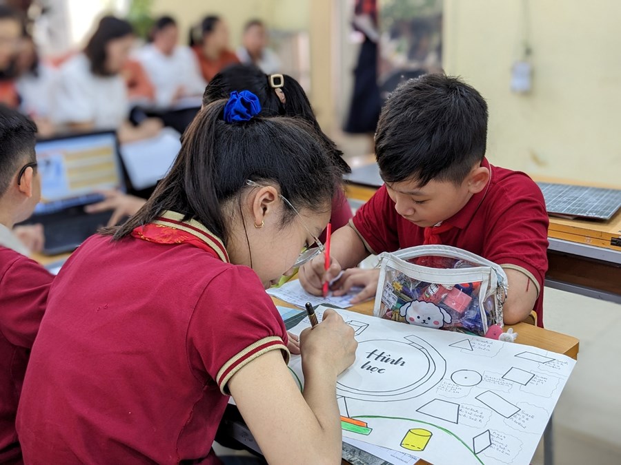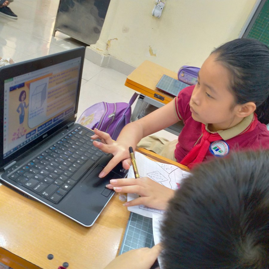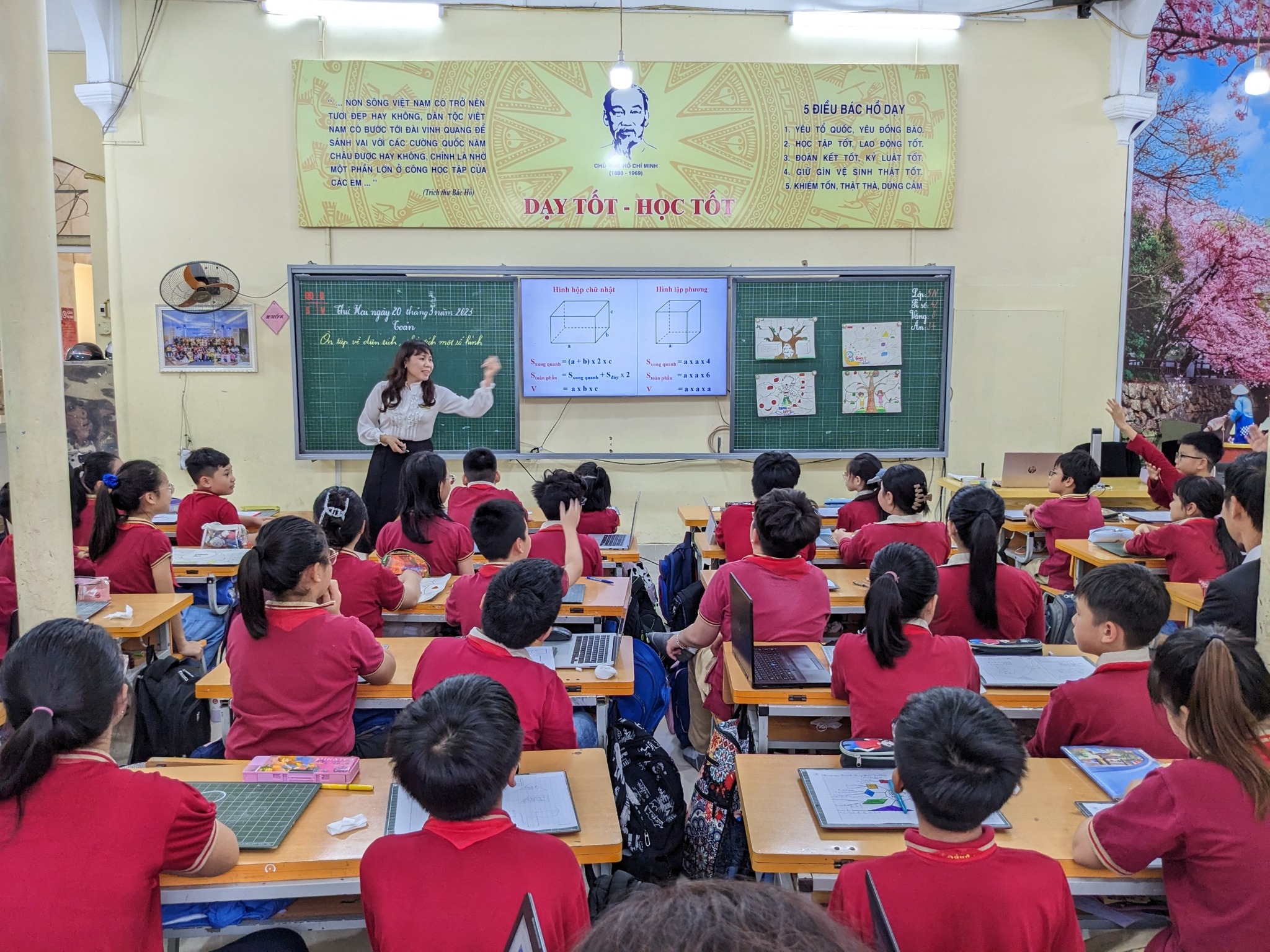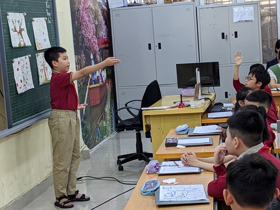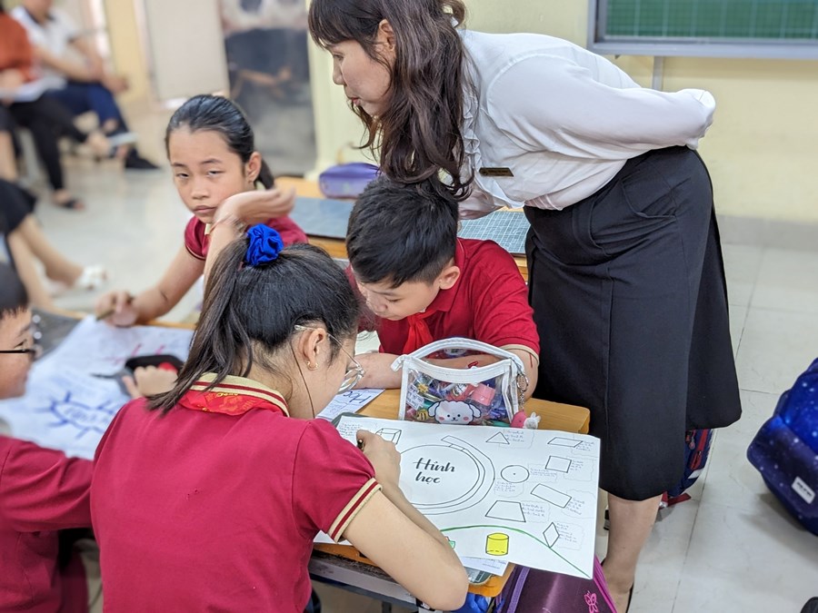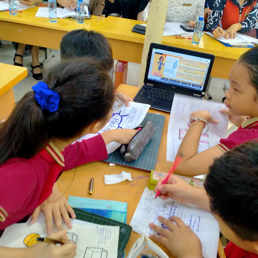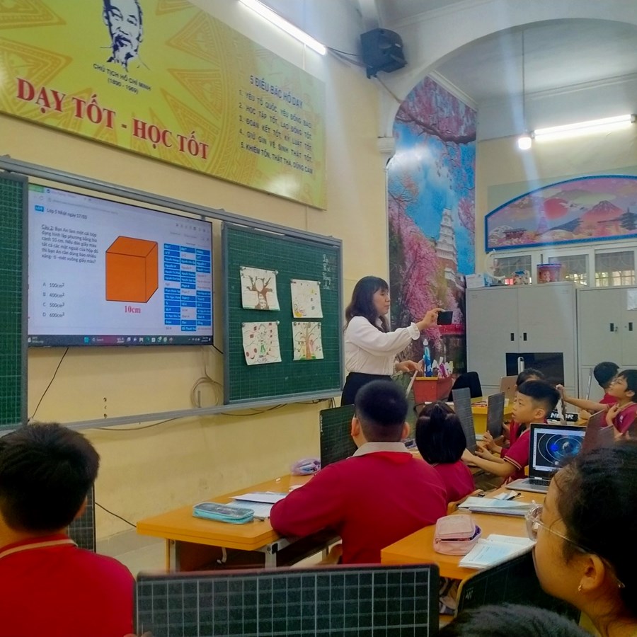 Cô giáo Dương Thị Hạnh và học sinh lớp 5 Nhật đại diện cho giáo viên, học sinh khối 5 thực hiện với tiết học "Ôn tập về tính diện tích, thể tích một số hình".