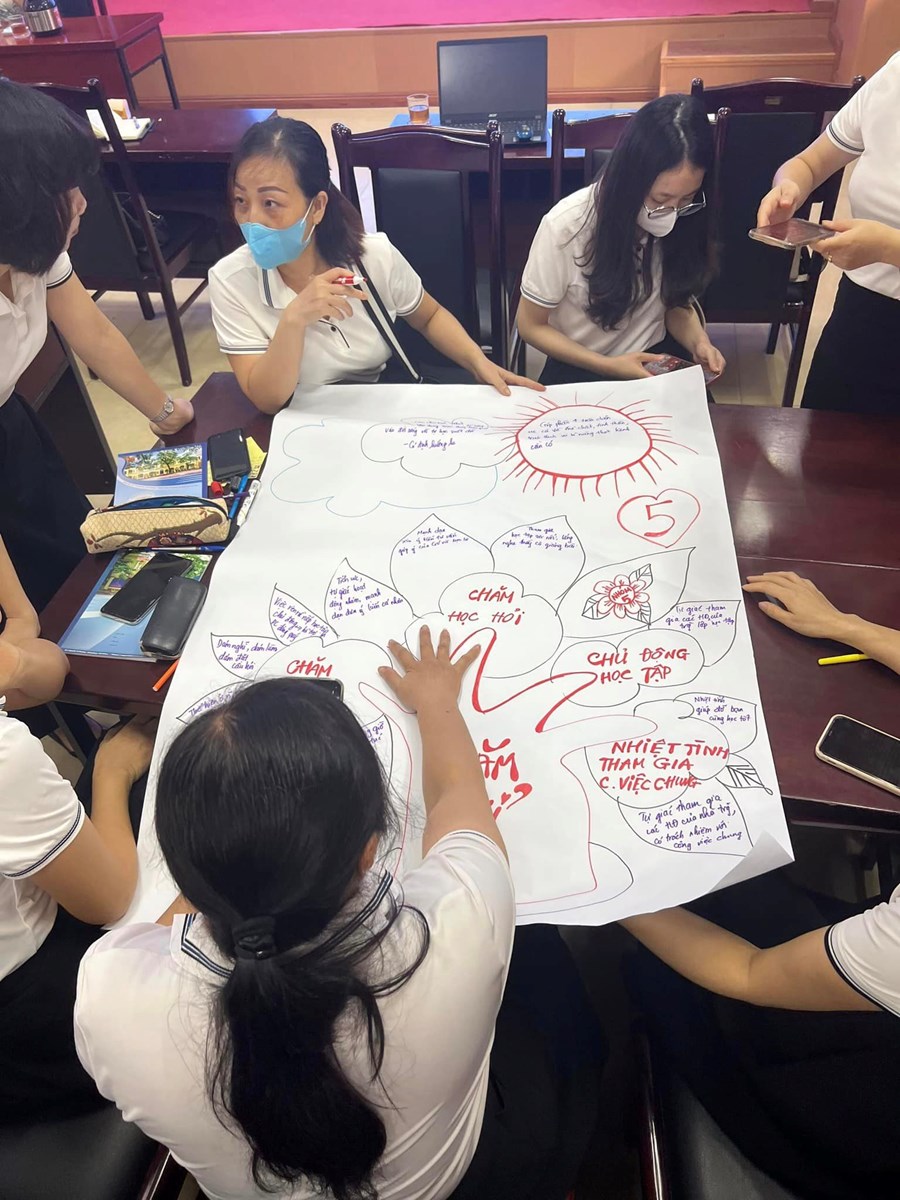 Qua buổi tập huấn, dưới sự dẫn dắt của cô giáo Song An, các thầy cô cùng trải nghiệm thực hành các phương pháp và kĩ thuật dạy học tích cực.