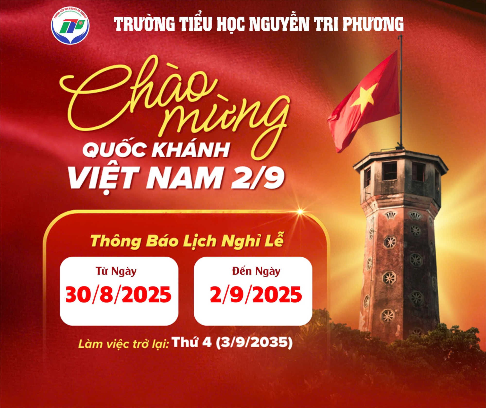 Hòa chung trong không khí tưng bừng của cả nước chào mừng 80 năm Ngày Quốc khánh nước Cộng hòa xã hội chủ nghĩa Việt Nam (02/9/1945 – 02/9/2025) – ngày lễ trọng đại của dân tộc, Trường Tiểu học Nguyễn Tri Phương trân trọng thông báo đến toàn thể cán bộ, giáo viên, nhân viên và học sinh về kế hoạch nghỉ lễ.