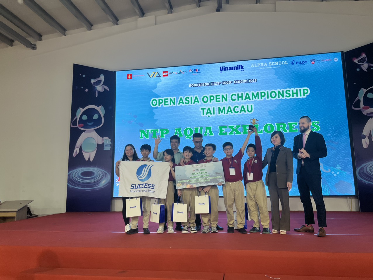 Đội NTP Aqua Explorers, gồm những học sinh nhỏ tuổi đầy bản lĩnh, đã xuất sắc vượt qua hàng trăm đội thi trên cả nước, chính thức đăng quang NGÔI VÔ ĐỊCH tại cuộc thi ROBOTACON FIRST LEGO LEAGUE 2025 – sự kiện công nghệ uy tín do Đại sứ quán Đan Mạch phối hợp tổ chức.
